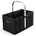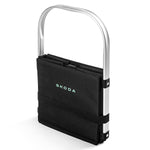 Practical shopping basket made of washable, water-repellent, durable material with solid aluminium handle. Bottom with removable pad. Elastic rubber band to hold the basket in a folded form. Printed Škoda logo on both sides in electric green.