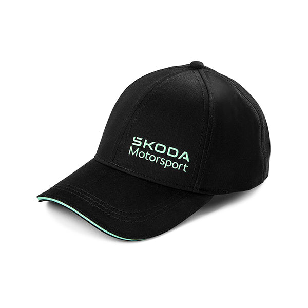 Baseball cap in black colour with plastic logo Škoda Motorsport in electric green. 6 panels, belt for regulation of the size in electric green with a metal buckle with logo Škoda Motorsport.