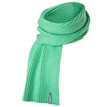 Knitted beanie and scarf set in electric green. Coarsely knitted pattern. Woven label in gray across the edge with Škoda logo.