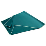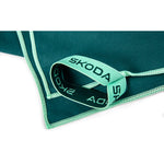 Functional towel in emerald green color. The towel is sewn with a contrasting electric green thread. The sewn-in rubber band with the Škoda logo serves as an eyelet or for rolling up a towel.
