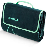 Practical picnic blanket made from combed fleece in a new Škoda design. The blanket has a waterproof material on the underside that serves as thermal insulation. The blanket can be easily folded and secured in its folded form with Velcro.