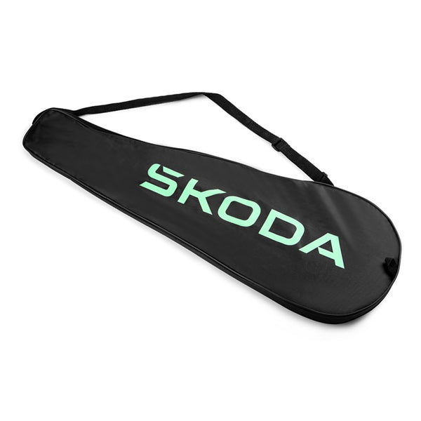 The badminton set includes two rackets in the color combination of electric and emerald green and two white cups in a tube. The whole set is in a practical case with the Škoda logo in electric green. Adjustable strap on the case for easy carrying.
