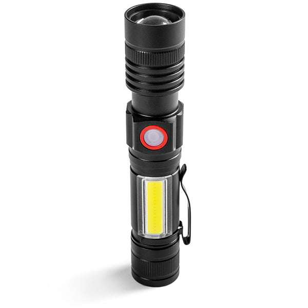 LED flashlight with magnet, clip and two lights. Rechargeable battery via cable with a capacity of 6800 mAh(included). Front light 400 lumens and side light 640 lumens.